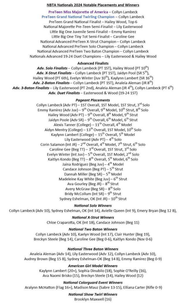 The 2020 & 2021 AYOP National Baton Twirling Championships were postponed due to the Covid-19 crisis.