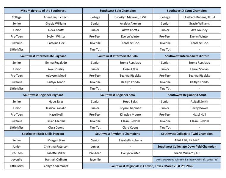 | 2026 | March 28 & 29 | Amarillo | Gretta Johnson & Brittany Ashcraft | N | First United Bank Center |